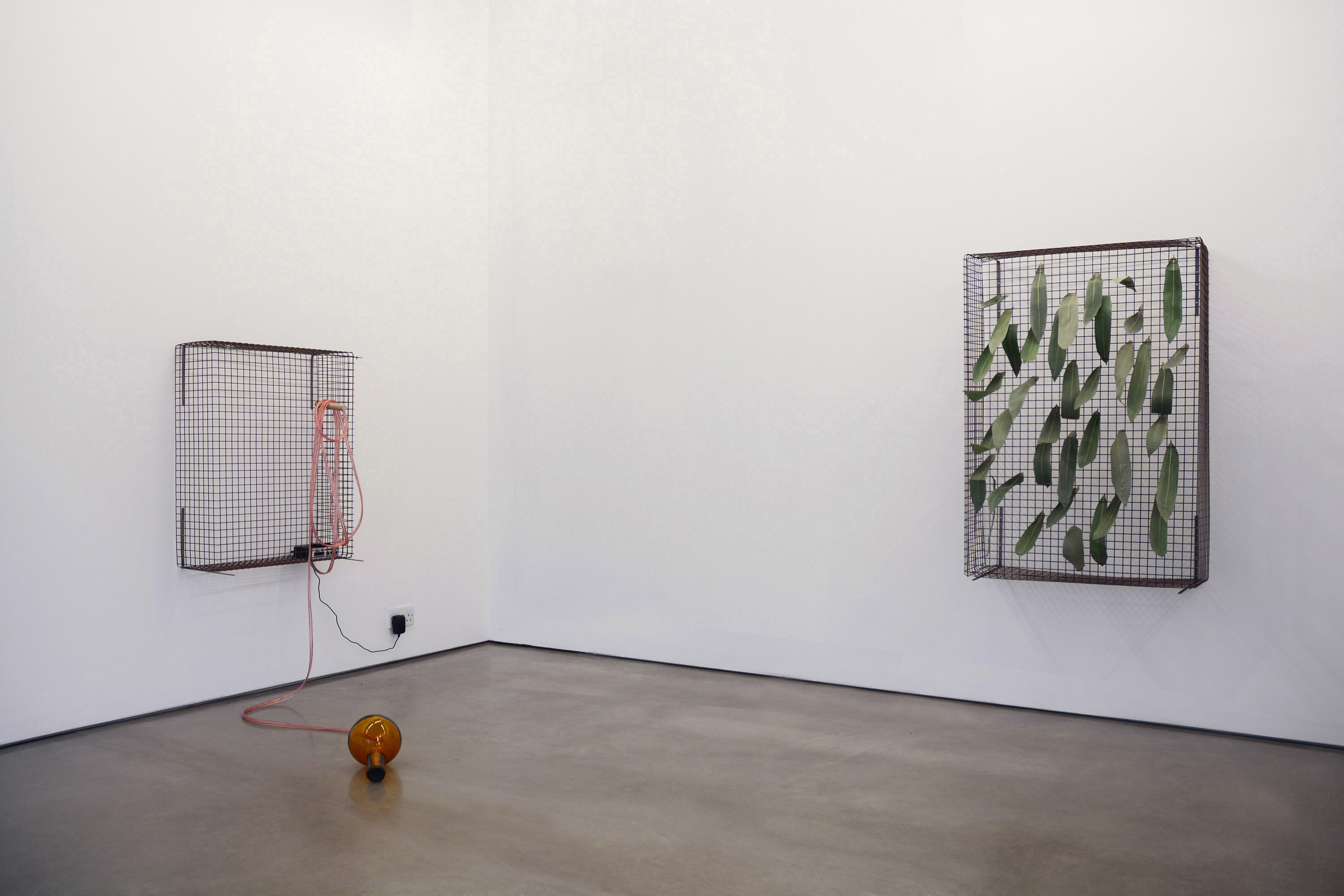 Aluminium, chrome plated steel, flour, found object, glass, Japanese paper, leaf, paint, perspex, plaster, plastic, plywood, powder coated mild steel, string, wax